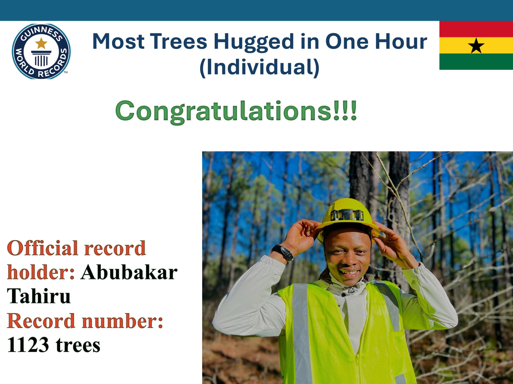 “The most trees hugged in one hour (individual) is 1,123, and was achieved by Abubakar Tahiru (Ghana), in Auburn, Alabama, USA, on 25 March 2024.