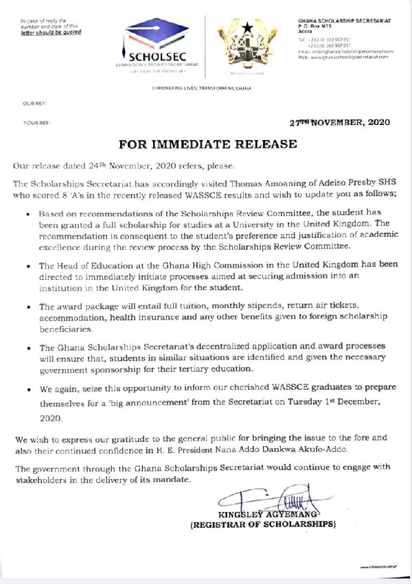 The Ghana Scholarship Secretariat has announced that it has granted Thomas Amoaning, a student of Adeiso Presby SHS who excelled in his WASSCE, full scholarship for studies in the United Kingdom.