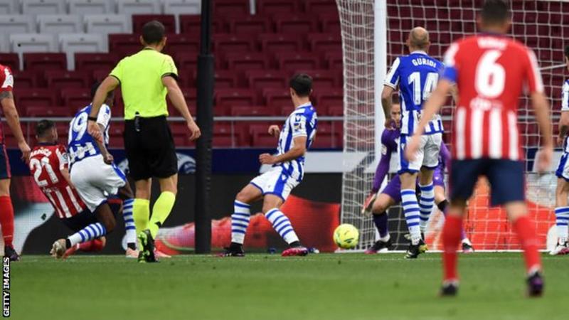 Yannick Carrasco put Atletico ahead when he collected Marcos Llorente’s ball over the top of the Sociedad defence and finished past Alex Remiro.