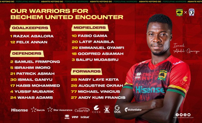 Asante Kotoko coach, Mariano Barreto has announced an 18-man squad for their outstanding game against Bechem United tomorrow.