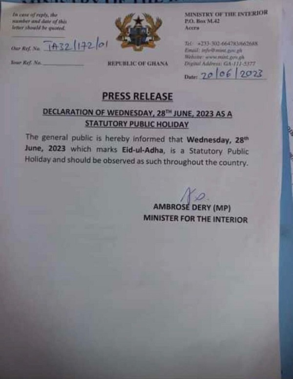 The Ministry of Interior has officially announced Wednesday, June 28, 2023, as a statutory public holiday in Ghana.