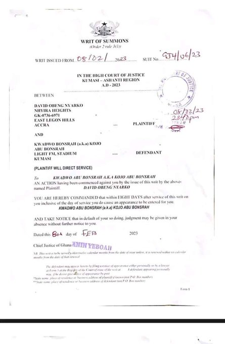 Bonsrah is by the writ issued on Wednesday, February 8, 2023, expected to make an appearance in court.