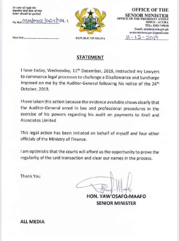 But in a statement issued by Mr Osafo Maafo on Wednesday [December 11, 2019], he argued that the evidence available shows clearly that the Auditor General erred in law and professional procedures in the exercise of his powers regarding his audit on payments to Kroll and Associates Limited.