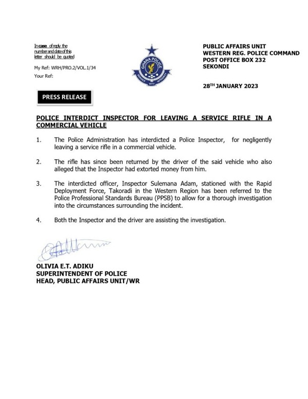 The Ghana Police Service has taken a serious step towards upholding its commitment to professional conduct by announcing the interdiction of a police inspector who negligently left a service rifle in a commercial vehicle. The inspector, named as Inspector Sulemana Adam, was stationed with the Rapid Deployment Force in Takoradi in the Western Region.